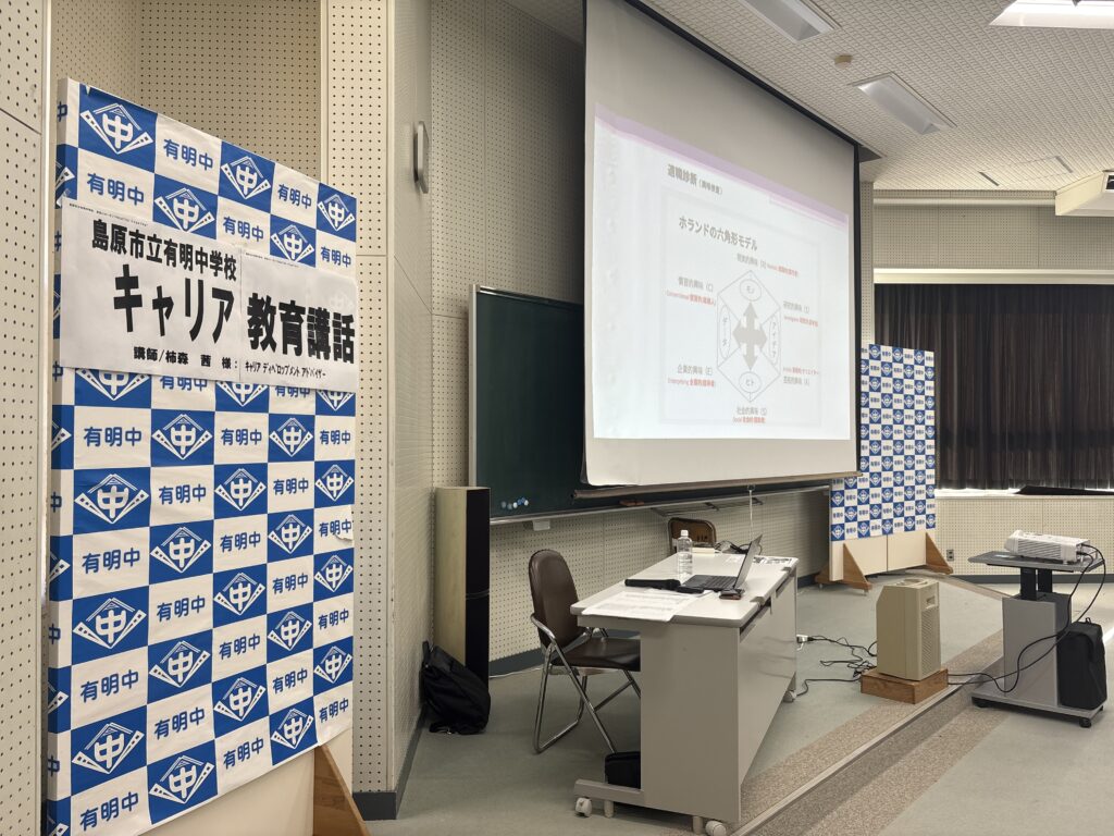 1/23(金)に島原市立有明中学校1年生約80名に対し、かっきー室長がキャリアの授業を行いました。 進路選択や職業選択をするうえで大切な自己分析や適職診断を通して、自分に合った仕事を見つけていきます。 変化が激しく予測が困難なVUCA時代と言われる社会において必要となる能力についてもお話をさせて いただきました。有明中学校の生徒達の反応を知ることができてとても楽しい時間でした。ありがとうございました。