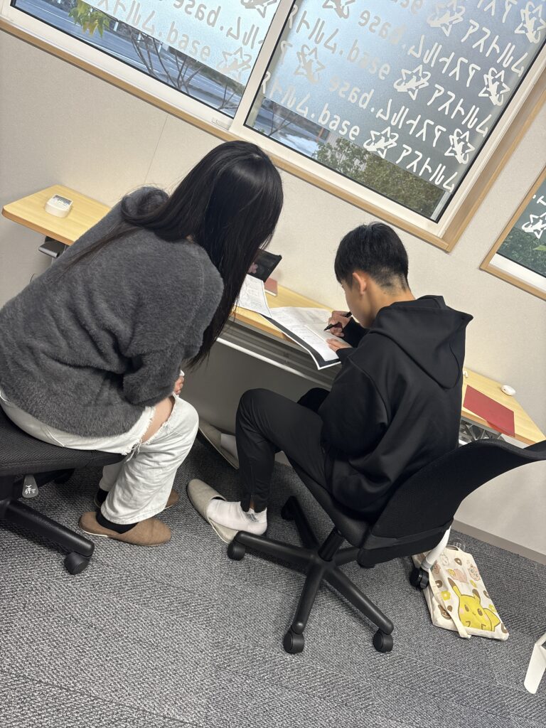 今日は、中3の受験生が自習に来て数学の問題に躓き悩んでいたところ、隣の部屋で自習をしてい高校生がその生徒と一緒に数学の問題を解き、ノートに書きながら丁寧に彼女に解説してくれました!
